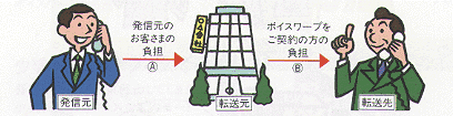 転送元から転送先まで(下図B)の通話料は、転送元(INSボイスワープをご契約いただいている電話)のお客さまのご負担となります。