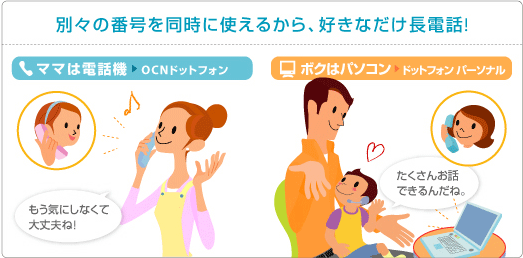 | お友達との長電話が好きなママ。ママがOCNドットフォンで電話を使っている時も同時にパソコンからドットフォン パーソナルの番号で電話できるんだ。どちらも通話料はとってもおトク! |